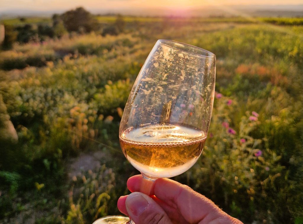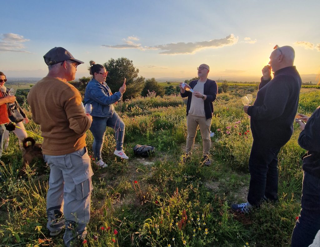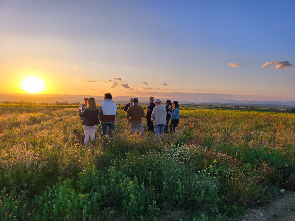 Nous ferons une pause pour savourer l’instant en admirant un coucher de soleil , la fameuse et inoubliable « GOLDEN HOUR ». Un verre de notre cuvée effervescente, Aurosa, vous sera servi pour une petite dégustation en plein air. Vous êtes face à un paysage de carte postale, la montagne Noire à l’horizon se teinte des plus bons tons roses et oranges . Le crépuscule arrive, il est temps de redescendre et de gagner la cave.